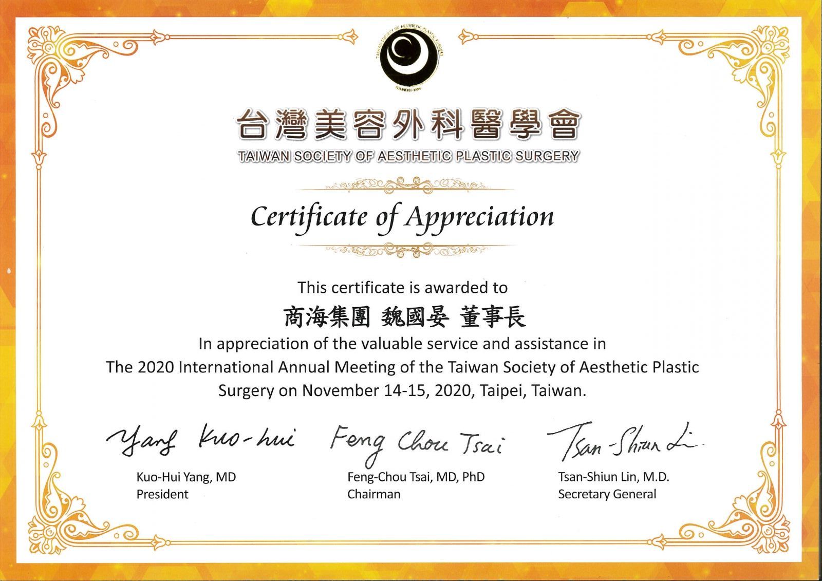 商海集團 魏國晏 董事長 榮獲 台灣美容外科醫學會 頒發感謝狀🎉🎉🎉